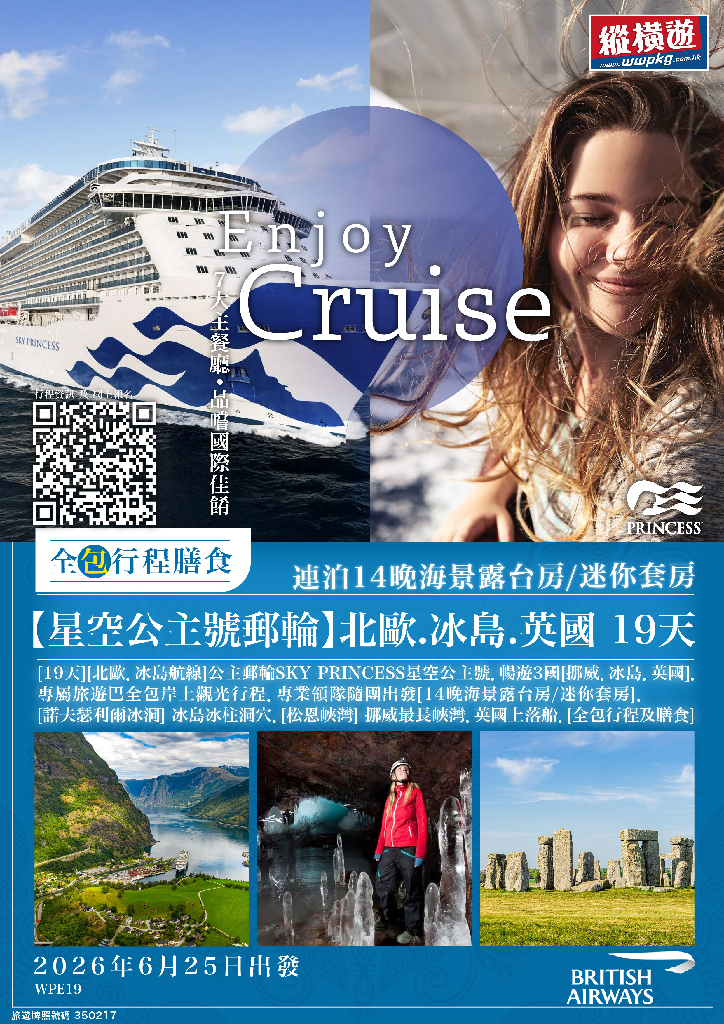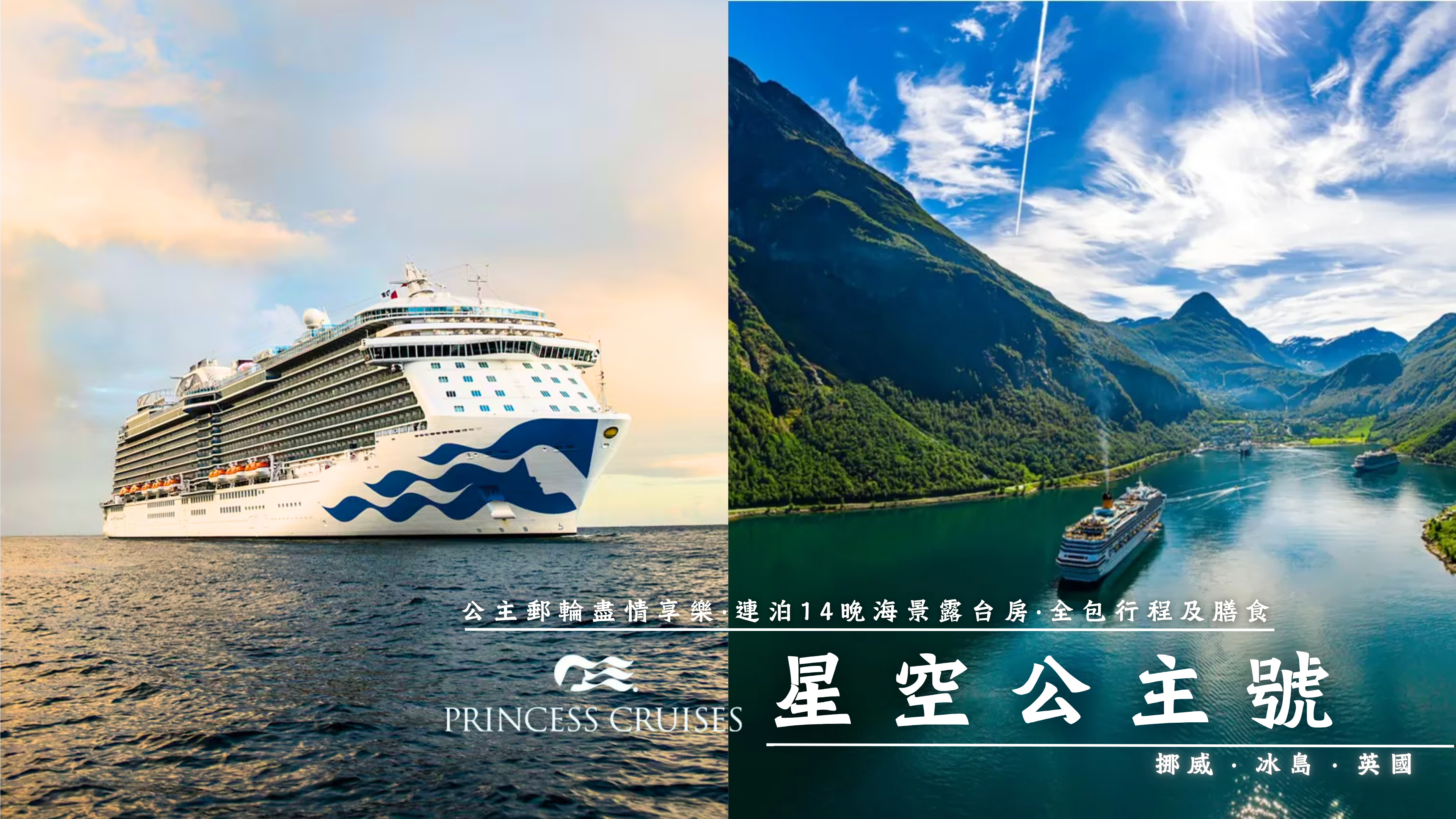 [19天] [北歐.冰島航線]🛳️公主郵輪 SKY PRINCESS星空公主號.暢遊3國 [挪威.冰島.英國].專屬旅遊巴全包岸上觀光行程.專業領隊隨團出發 [14晚海景露台房/迷你套房].[諾夫瑟利爾冰洞] 冰島冰柱洞穴.[松恩峽灣] 挪威最長峽灣.英國上落船 [全包行程及膳食]
