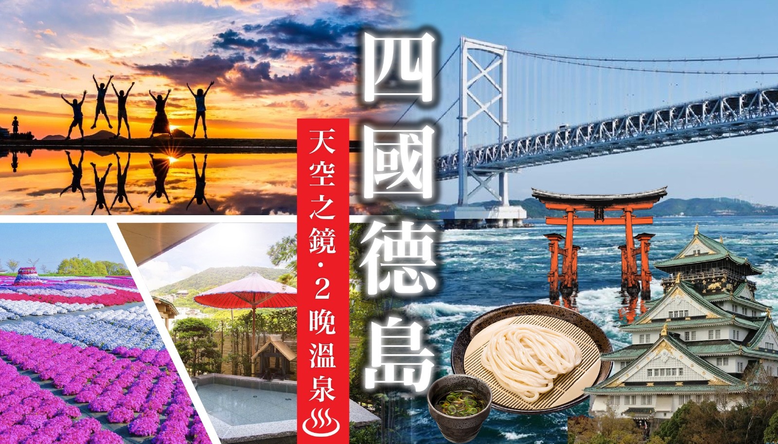 [7天] [百選四國] 四國德島.天空之鏡 [父母濱].廣島世產嚴島神社.夢幻紫藤花/繡球花之丘. 大步危峽遊船.旅館百選【櫻之抄/琴參閣】.[蟹道樂] 蟹料理.德島鳴門漩渦.和三盆和菓子.大阪梅田MONTEREY.3大名園.2晚溫泉 [可提升私人溫泉]